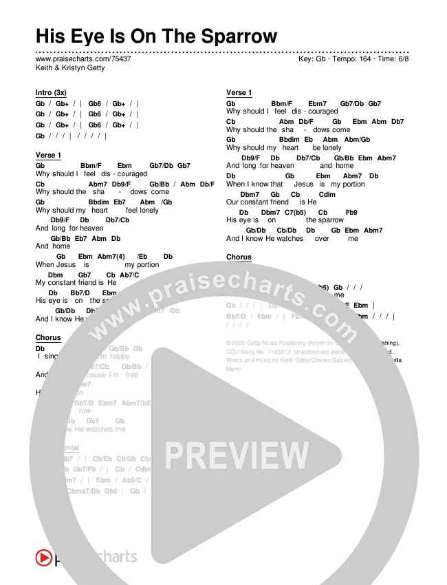 Download the PDF Chord Charts for His Eye Is On The Sparrow by Keith & Kristyn Getty, from the album Evensong - Hymns And Lullabies At The Close Of Day. This song was arranged by Daniel Galbraith in the key of G, Gb.