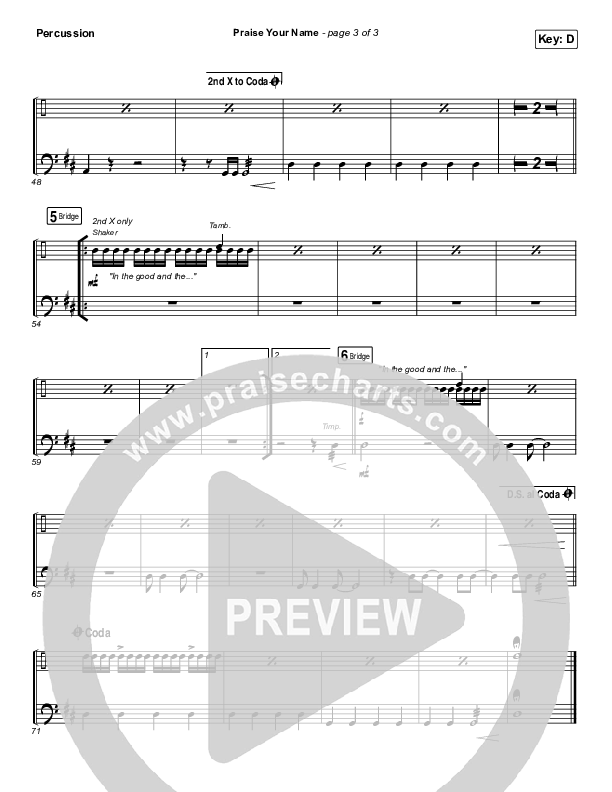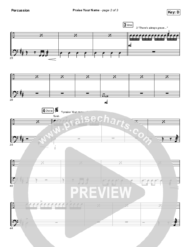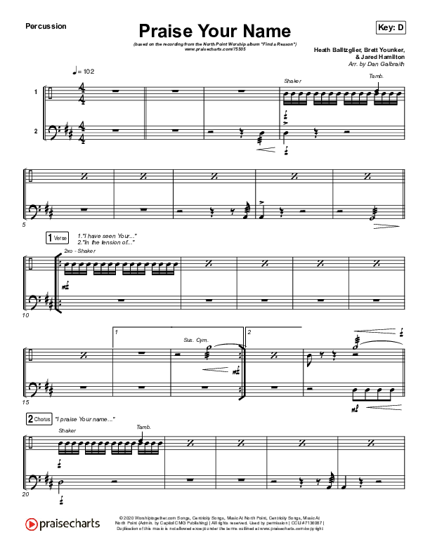 Download the percussion sheet music for Praise Your Name by North Point Worship, from the album Find A Reason - EP. This song was arranged by Daniel Galbraith in the key of C, D.