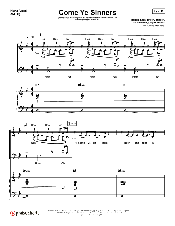 Download the sheet music for Come Ye Sinners by Shane & Shane / The Worship Initiative / Davy Flowers, from the album Come Ye Sinners - Single. This song was arranged by Daniel Galbraith in the key of Bb, C.