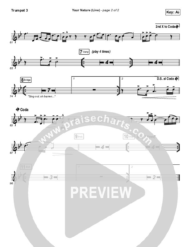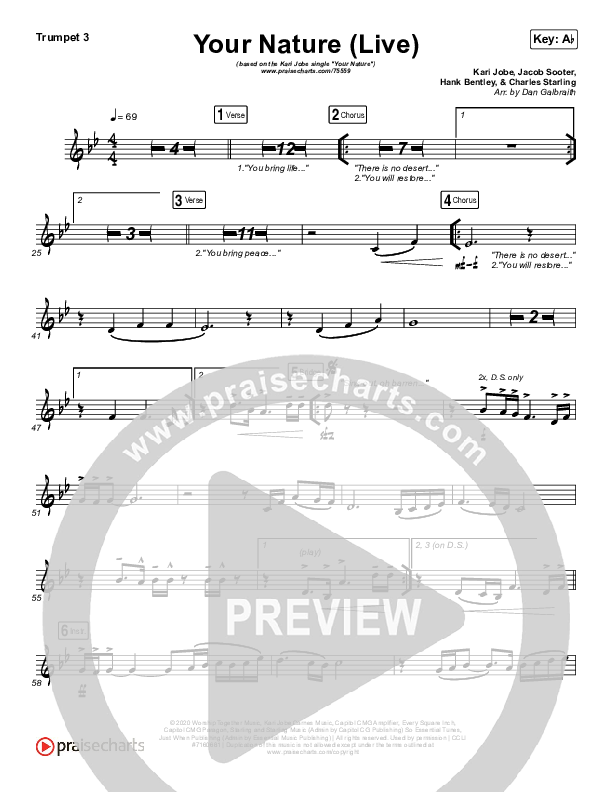Download the Trumpet 3 sheet music for Your Nature (Live) by Kari Jobe, from the album The Blessing. This song was arranged by Daniel Galbraith in the key of A, Ab.