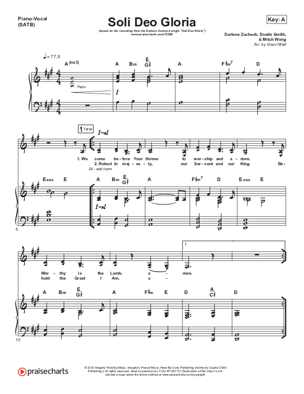 Download the sheet music for Soli Deo Gloria by Darlene Zschech / Mitch Wong, from the album Soli Deo Gloria - Single. This song was arranged by Grant Wall in the key of A, Ab.