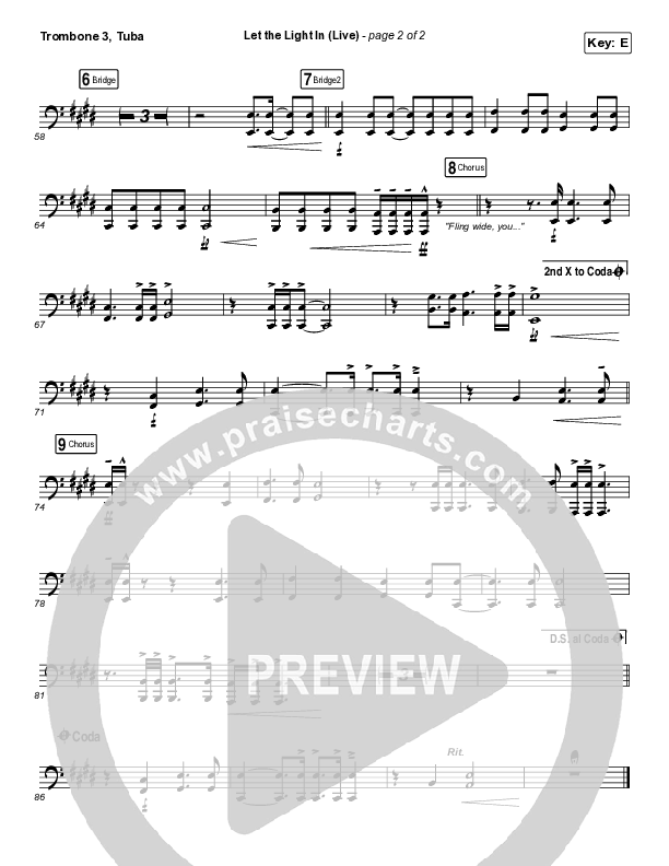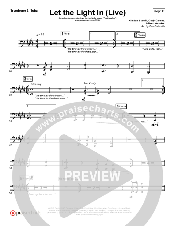 Download the Trombone 3/Tuba sheet music for Let The Light In (Live) by Kari Jobe, from the album The Blessing. This song was arranged by Daniel Galbraith in the key of E, F.