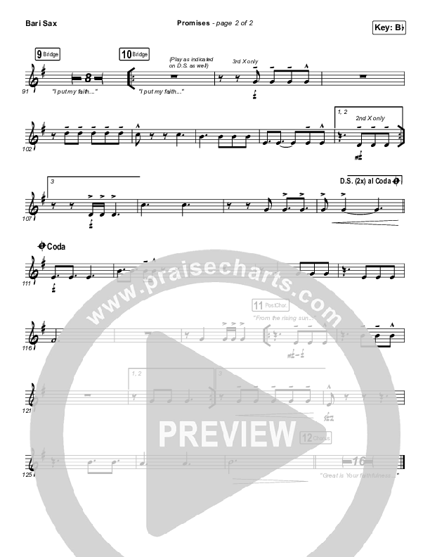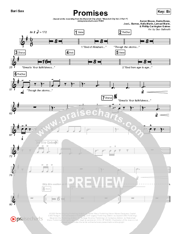 Download the Bari Sax sheet music for Promises by Maverick City Music, from the album Maverick City Vol 3 Part 1. This song was arranged by Daniel Galbraith in the key of A, Bb.