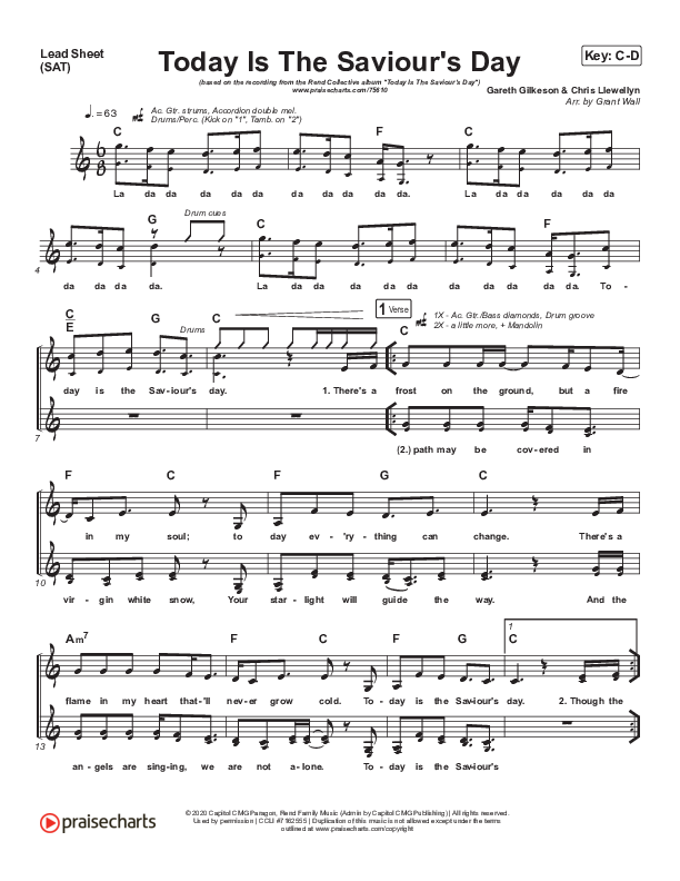 Download the sheet music for Today Is The Saviour's Day by Rend Collective, from the album A Jolly Irish Christmas (Vol 2). This song was arranged by Grant Wall in the key of Bb, C.