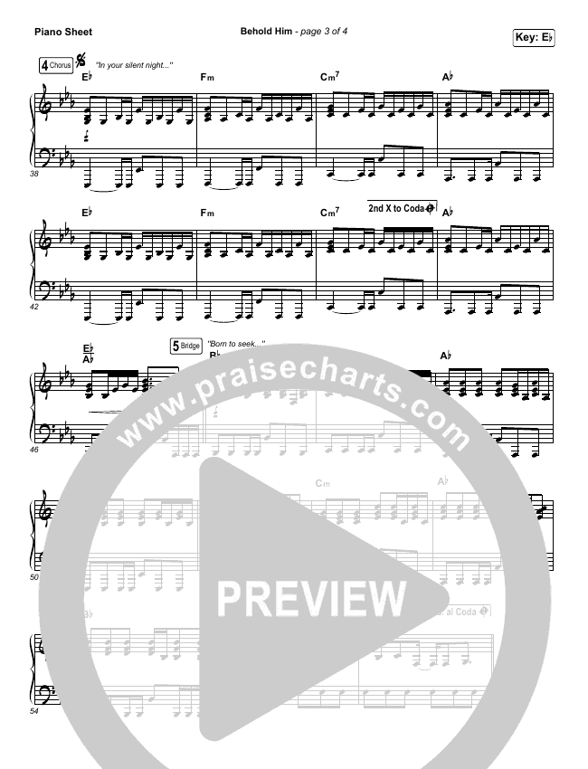 Download the piano sheet for Behold Him by Francesca Battistelli, from the album This Christmas. This song was arranged by Daniel Galbraith in the key of E, Eb.