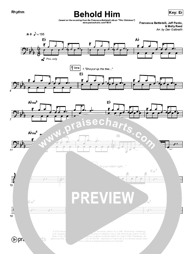 Download the Rhythm Chart for Behold Him by Francesca Battistelli, from the album This Christmas. This song was arranged by Daniel Galbraith in the key of E, Eb.