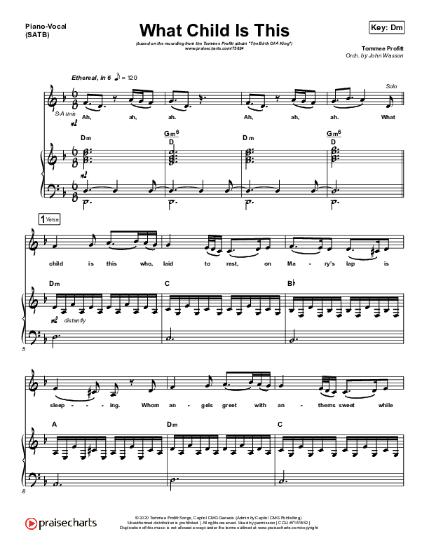 Download the sheet music for What Child Is This by Tommee Profitt / Avril Lavigne, from the album The Birth Of A King. This song was arranged by John Wasson in the key of C#m, Dm.