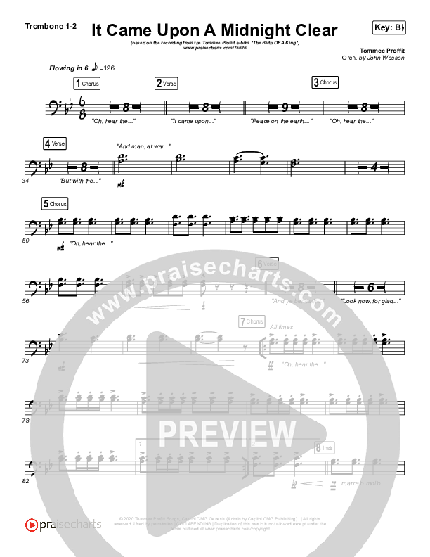 Download the Trombone 1,2 sheet music for It Came Upon A Midnight Clear by Tommee Profitt / Brooke, from the album The Birth Of A King. This song was arranged by John Wasson in the key of A, Ab, Bb.