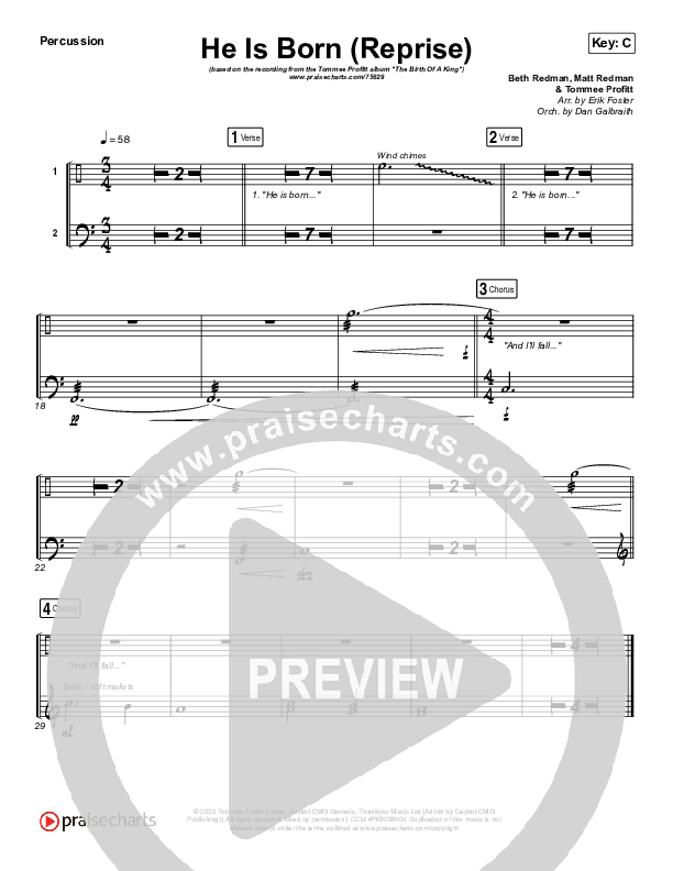 Download the percussion sheet music for He Is Born (Reprise) by Tommee Profitt / Chris Tomlin / Fleurie, from the album The Birth Of A King. This song was arranged by Erik Foster / Daniel Galbraith in the key of C, D.