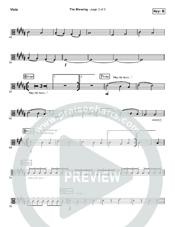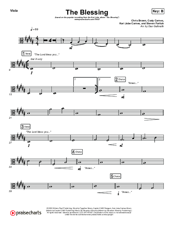 Download the Viola sheet music for The Blessing by Kari Jobe / Cody Carnes, from the album The Blessing. This song was arranged by Daniel Galbraith in the key of A, B, Bb.