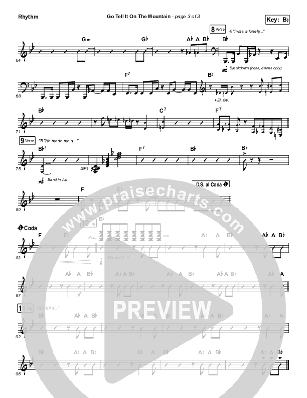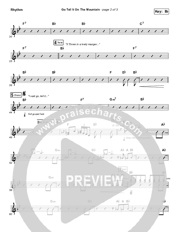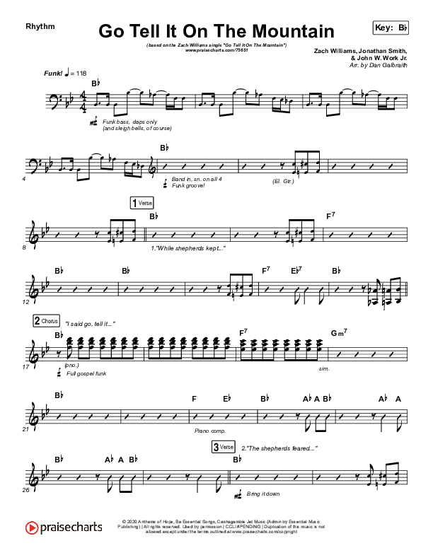Download the Rhythm Chart for Go Tell It On The Mountain by Zach Williams, from the album Go Tell It On The Mountain. This song was arranged by Daniel Galbraith in the key of A, Bb, C, G.