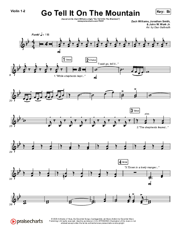 Download the Violin sheet music for Go Tell It On The Mountain by Zach Williams, from the album Go Tell It On The Mountain. This song was arranged by Daniel Galbraith in the key of A, Bb, C, G.