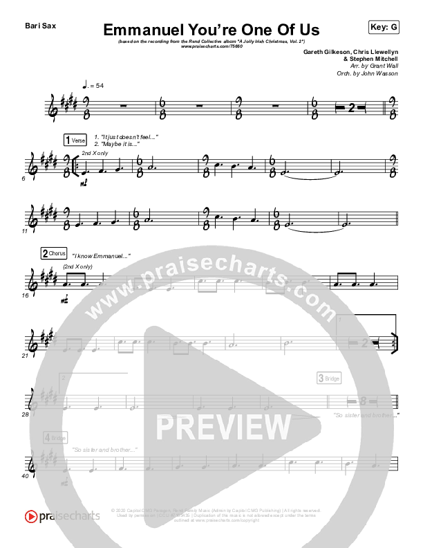 Download the Bari Sax sheet music for Emmanuel You’re One Of Us by Rend Collective / Elle Limebear, from the album A Jolly Irish Christmas (Vol 2). This song was arranged by Grant Wall / John Wasson in the key of F, G.