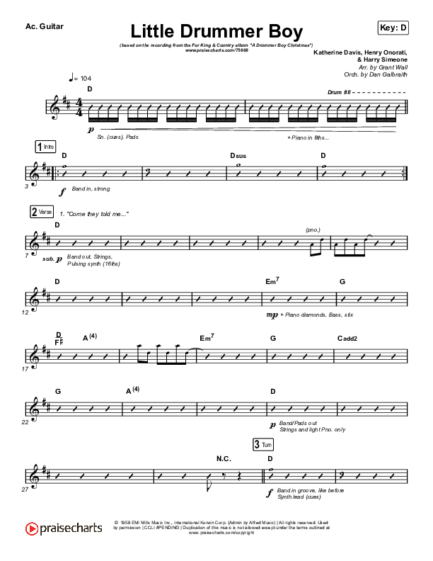 Download the Acoustic Guitar sheet music for Little Drummer Boy by for KING & COUNTRY, from the album A Drummer Boy Christmas. This song was arranged by Grant Wall / Daniel Galbraith in the key of C, D.