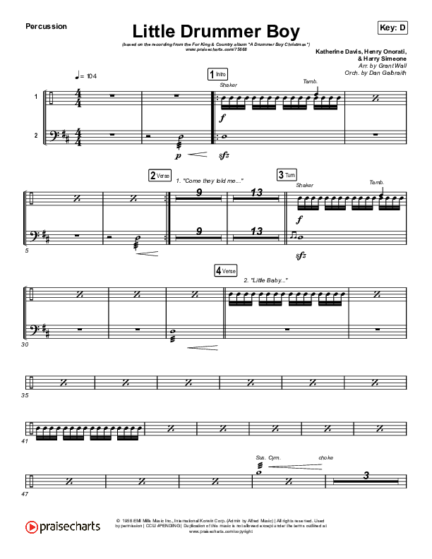 Download the percussion sheet music for Little Drummer Boy by for KING & COUNTRY, from the album A Drummer Boy Christmas. This song was arranged by Grant Wall / Daniel Galbraith in the key of C, D.