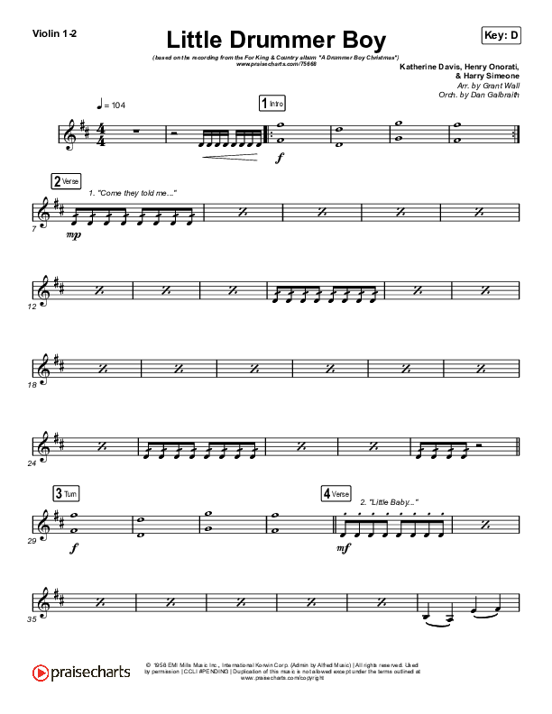 Download the Violin sheet music for Little Drummer Boy by for KING & COUNTRY, from the album A Drummer Boy Christmas. This song was arranged by Grant Wall / Daniel Galbraith in the key of C, D.