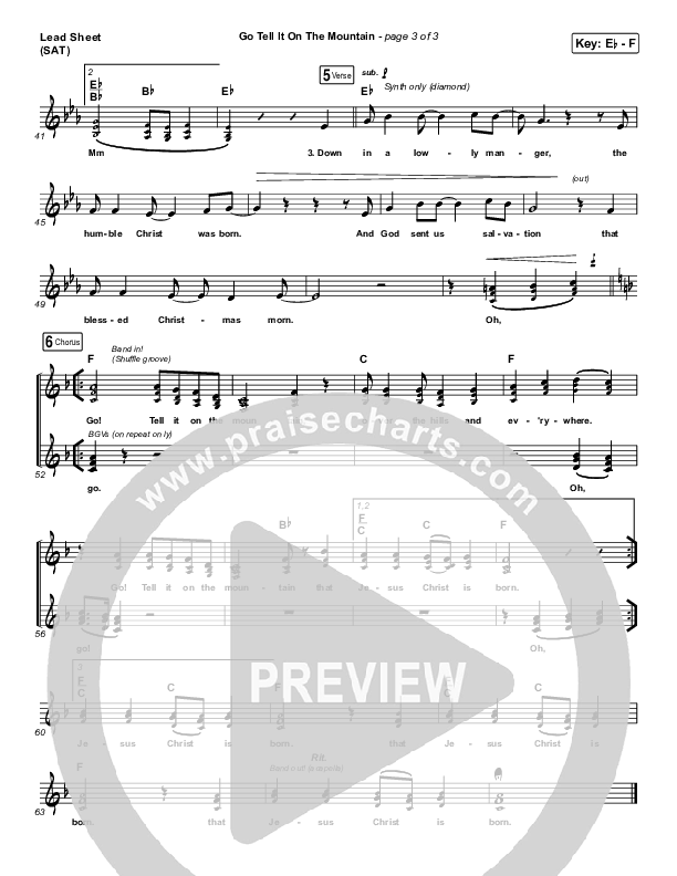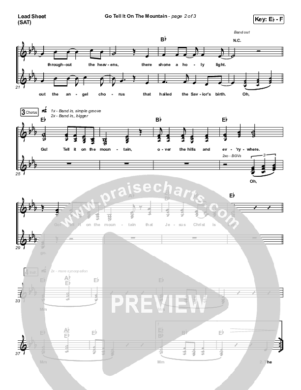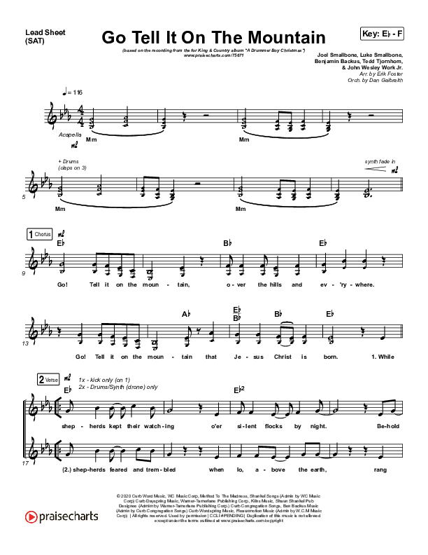Download the sheet music for Go Tell It On The Mountain by for KING & COUNTRY / Gabby Barrett, from the album A Drummer Boy Christmas. This song was arranged by Erik Foster / Daniel Galbraith in the key of Eb, F.