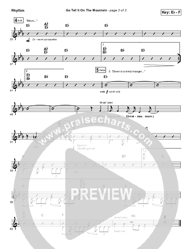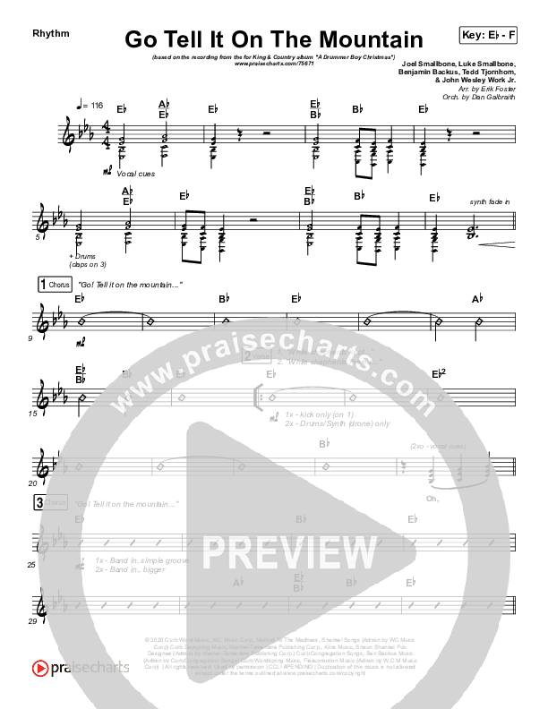 Download the Rhythm Chart for Go Tell It On The Mountain by for KING & COUNTRY / Gabby Barrett, from the album A Drummer Boy Christmas. This song was arranged by Erik Foster / Daniel Galbraith in the key of Eb, F.
