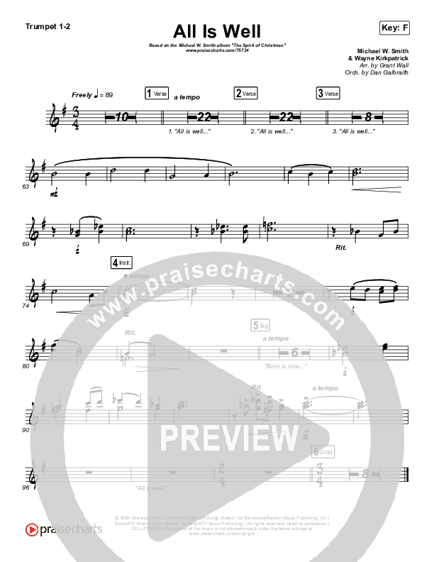 Download the trumpet sheet music for All Is Well by Michael W. Smith / Carrie Underwood, from the album The Spirit Of Christmas. This song was arranged by Grant Wall / Daniel Galbraith in the key of Eb, F.