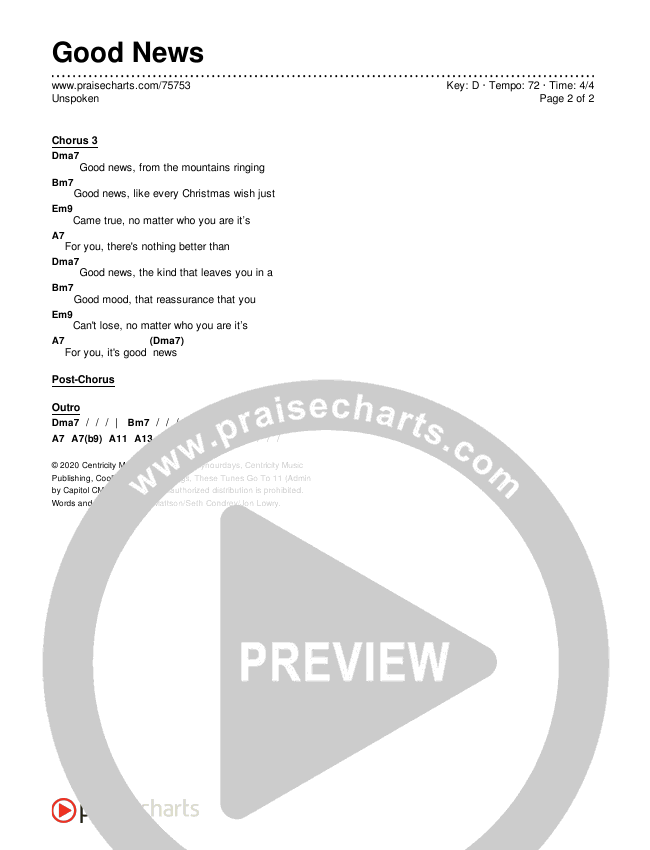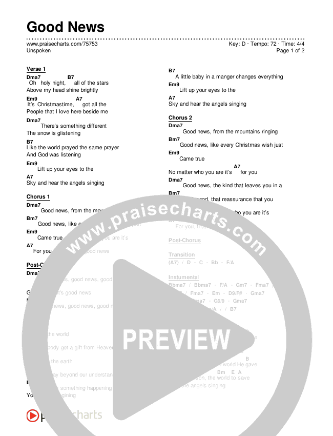 Download the PDF Chord Charts for Good News by Unspoken, from the album Good News. This song was arranged by Erik Foster in the key of C, D.