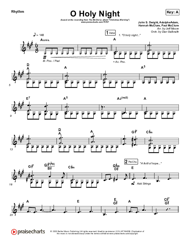 Download the Rhythm Chart for O Holy Night (Live) by The McClures / Hannah McClure / Paul McClure, from the album Christmas Morning (Live). This song was arranged by Jeff Moore / Daniel Galbraith in the key of A, Ab.
