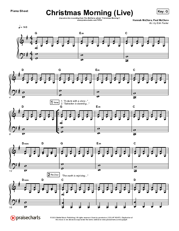 Download the piano sheet for Christmas Morning (Live) by The McClures / Hannah McClure / Paul McClure, from the album Christmas Morning (Live). This song was arranged by Erik Foster in the key of F, G.