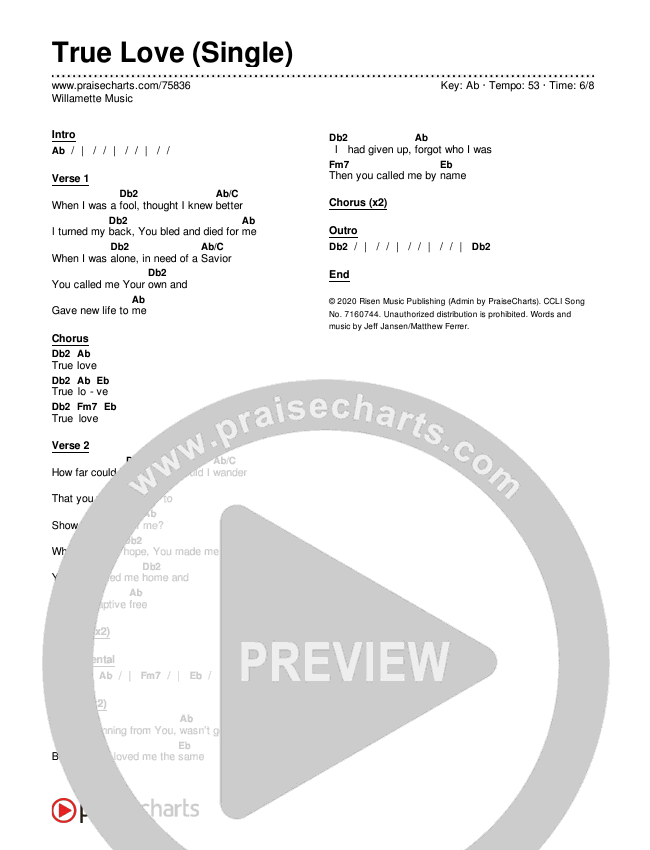 Download the PDF Chord Charts for True Love (Single) by Willamette Music, from the album True Love.