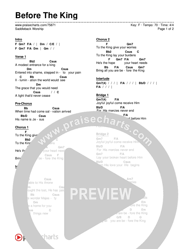 Download the PDF Chord Charts for Before The King by Saddleback Worship, from the album Before The King. This song was arranged by Daniel Galbraith in the key of F.