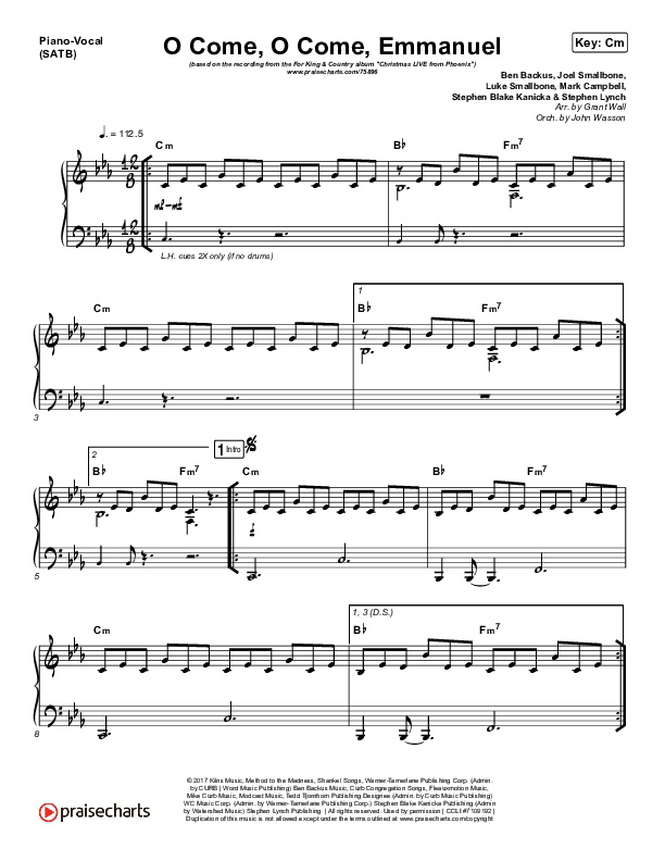 Download the sheet music for O Come O Come Emmanuel by for KING & COUNTRY, from the album Christmas LIVE From Phoenix. This song was arranged by Grant Wall / John Wasson in the key of C#m, Cm, Dm.
