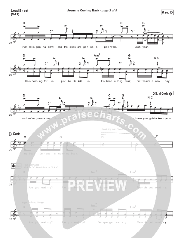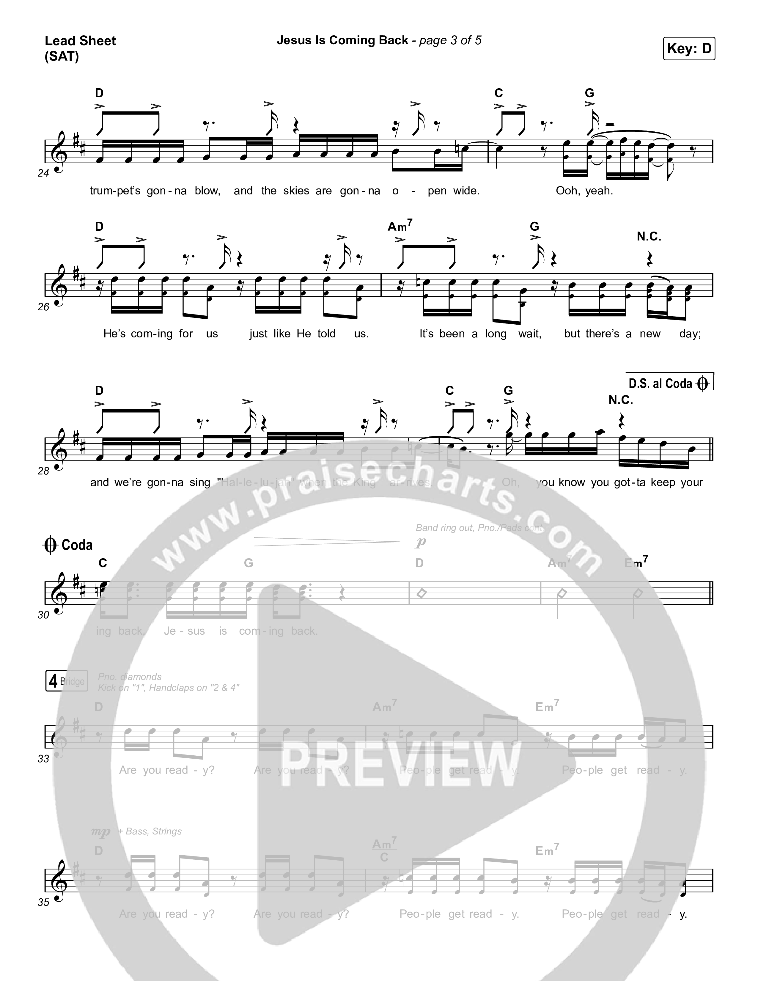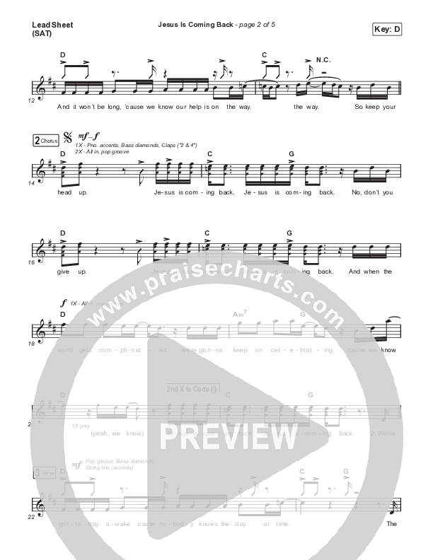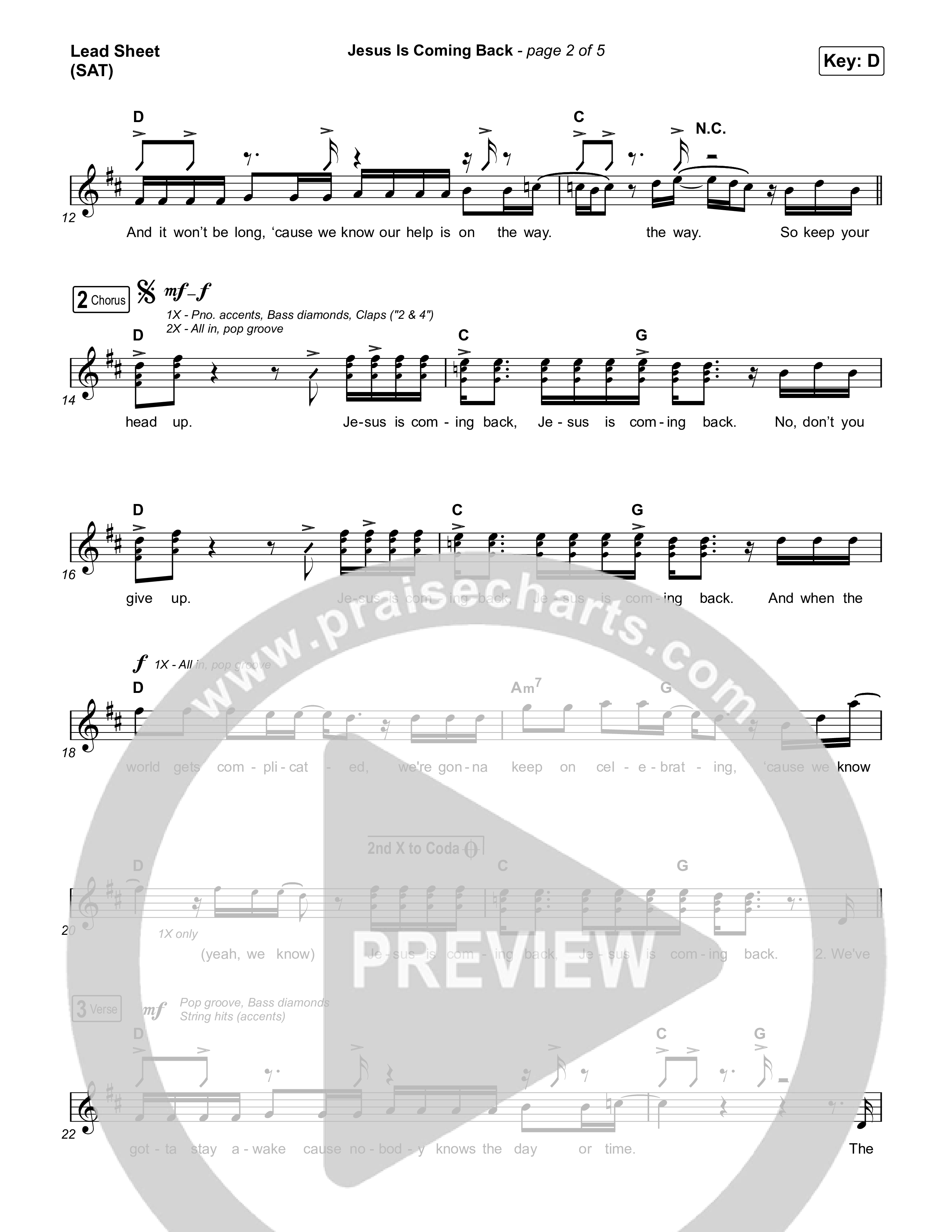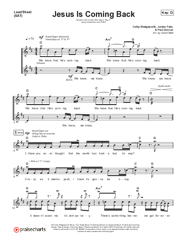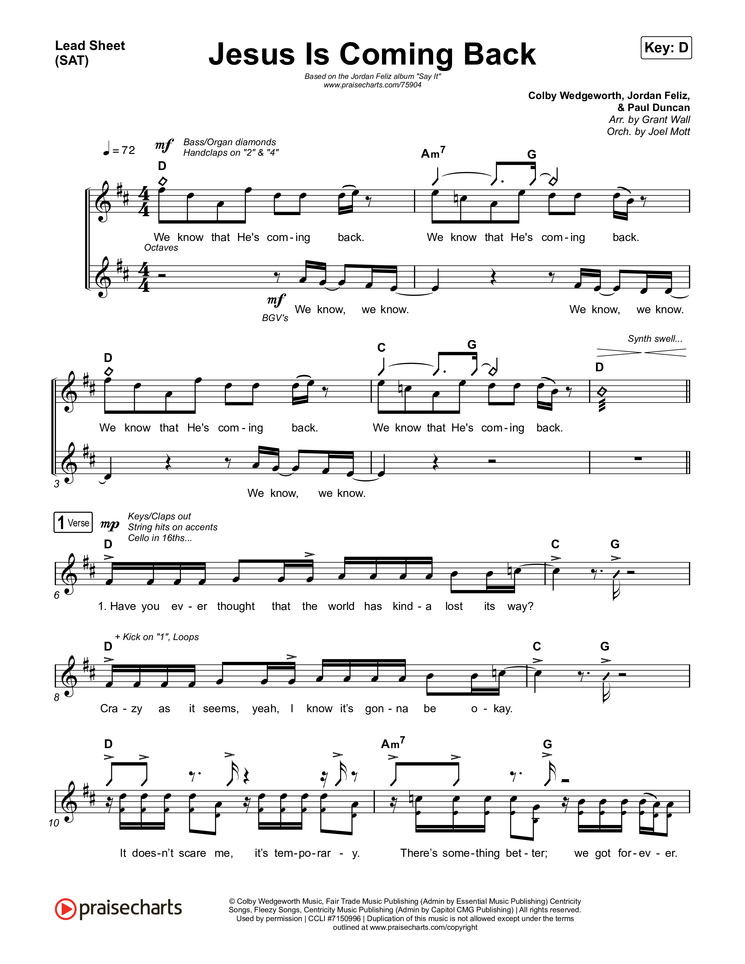 Download the sheet music for Jesus Is Coming Back by Jordan Feliz, from the album Say It. This song was arranged by Grant Wall in the key of D.