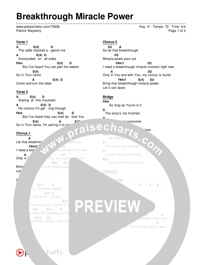 Download the PDF Chord Charts for Breakthrough Miracle Power by Patrick Mayberry, from the album Holy Spirit Come.
