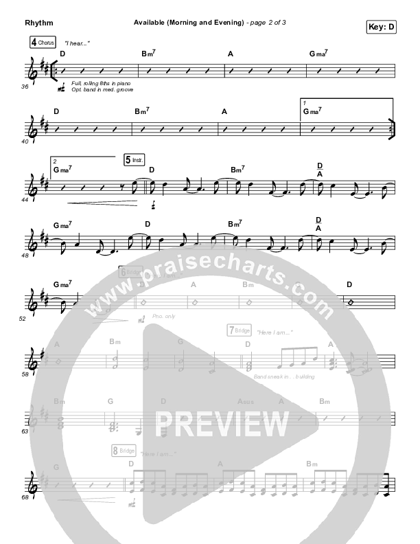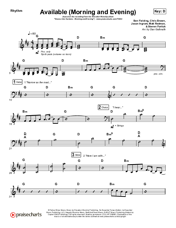 Download the Rhythm Chart for Available (Morning & Evening) by Elevation Worship, from the album Graves Into Gardens: Morning & Evening. This song was arranged by Daniel Galbraith in the key of C, D.
