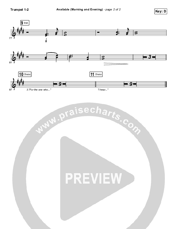 Download the trumpet sheet music for Available (Morning & Evening) by Elevation Worship, from the album Graves Into Gardens: Morning & Evening. This song was arranged by Daniel Galbraith in the key of C, D.