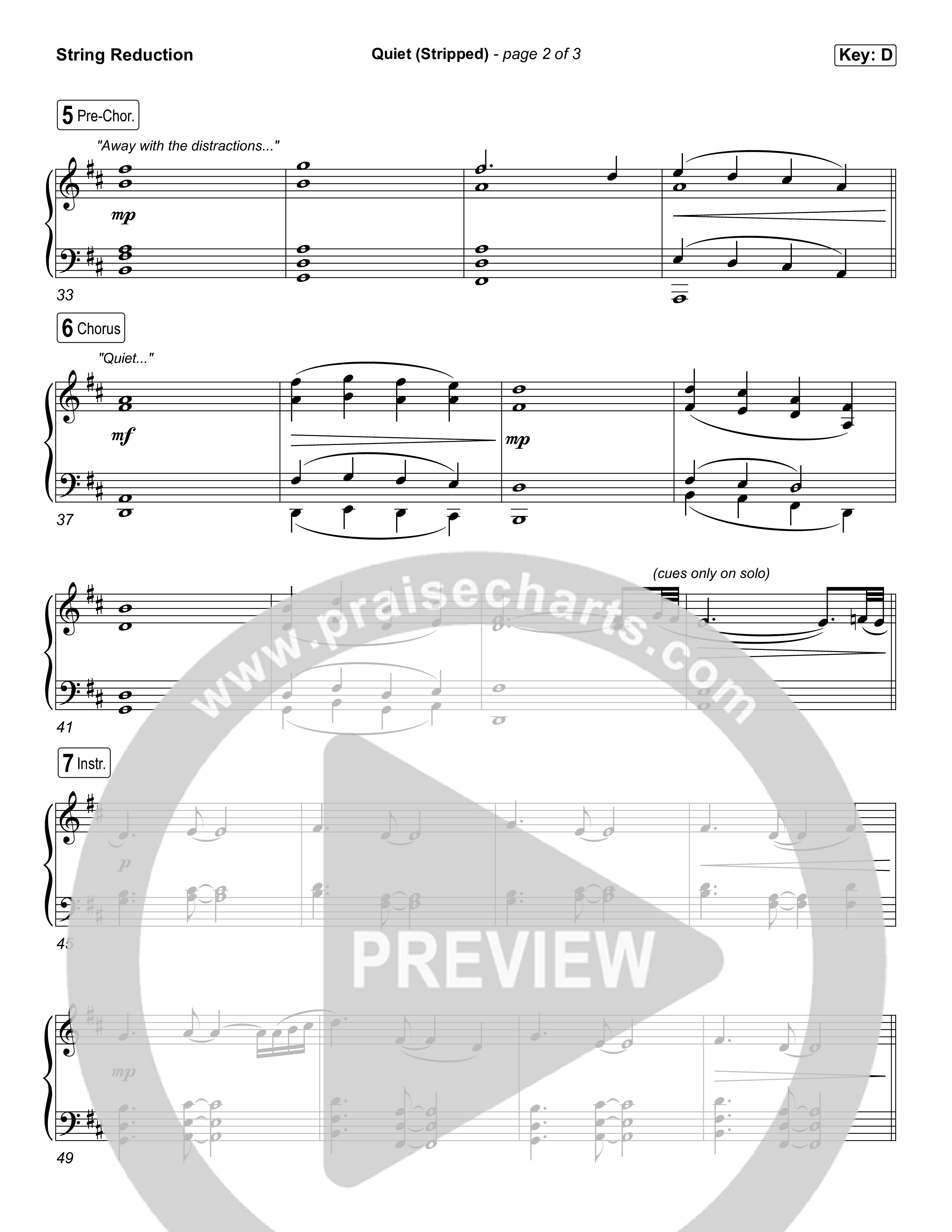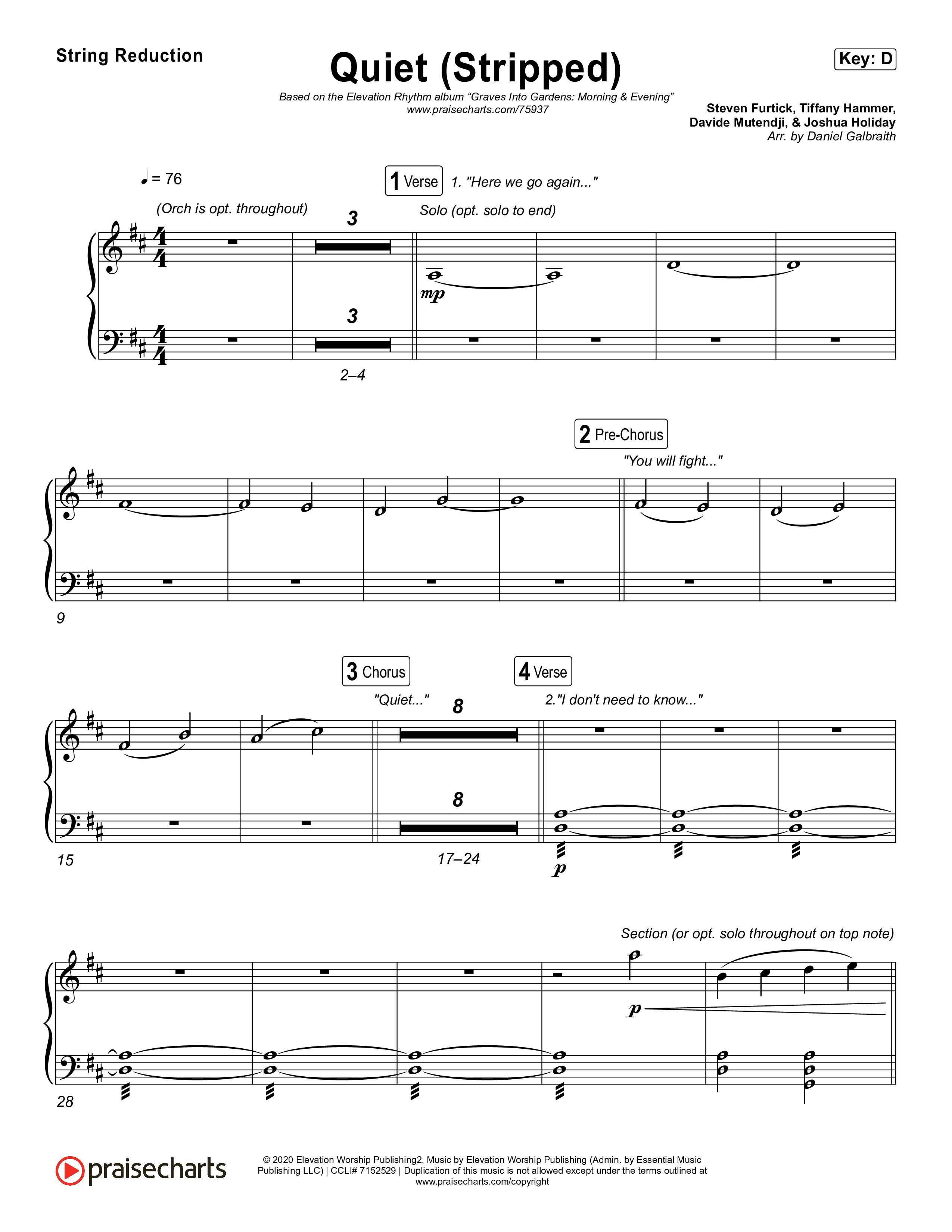 Download the String Reduction sheet music for Quiet (Stripped) by Elevation Worship / ELEVATION RHYTHM, from the album Graves Into Gardens: Morning & Evening. This song was arranged by Daniel Galbraith in the key of D, Eb.