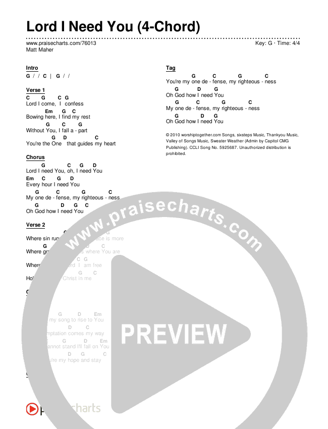 Download the PDF Chord Charts for Lord I Need You (4-Chord) by Matt Maher, from the album All The People Said Amen.