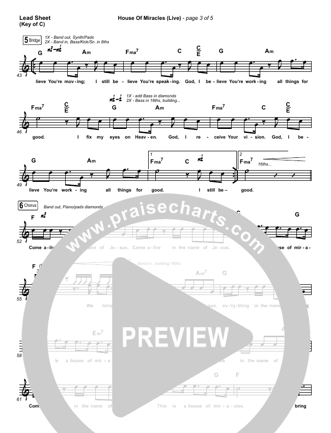 Download the sheet music for House Of Miracles (Live) by Brandon Lake, from the album House Of Miracles (Live). This song was arranged by Daniel Galbraith in the key of Bb, C.