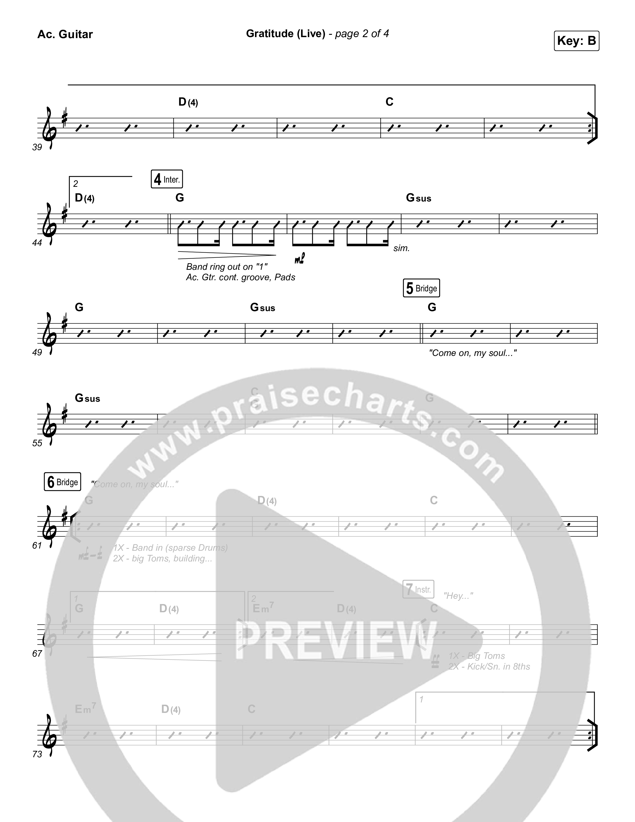 Download the Acoustic Guitar sheet music for Gratitude (Live) by Brandon Lake, from the album House Of Miracles (Live). This song was arranged by Grant Wall / Daniel Galbraith in the key of A, B, Bb, G, Gb.