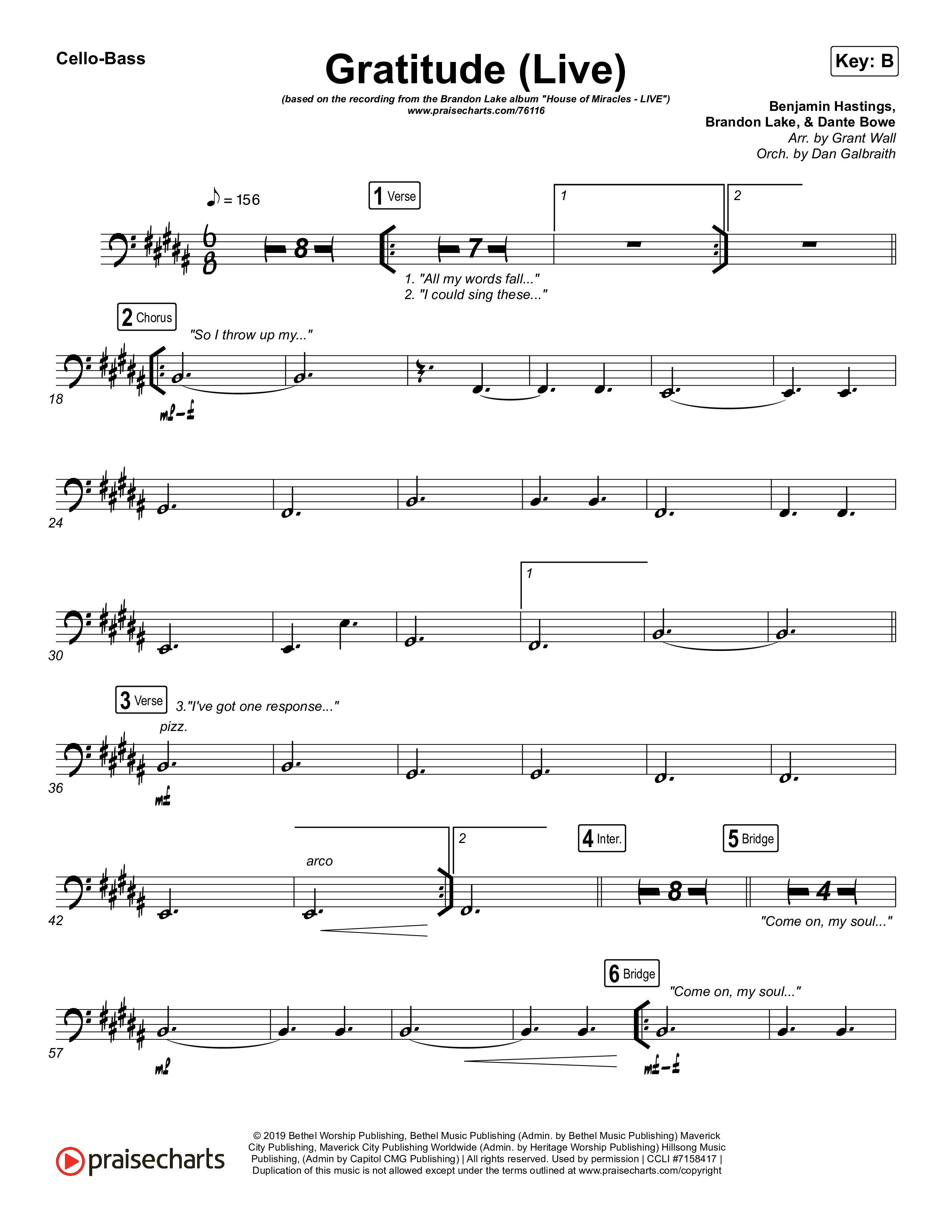 Download the Orchestration for Gratitude (Live) by Brandon Lake, from the album House Of Miracles (Live). This song was arranged by Grant Wall / Daniel Galbraith in the key of A, B, Bb, G, Gb.