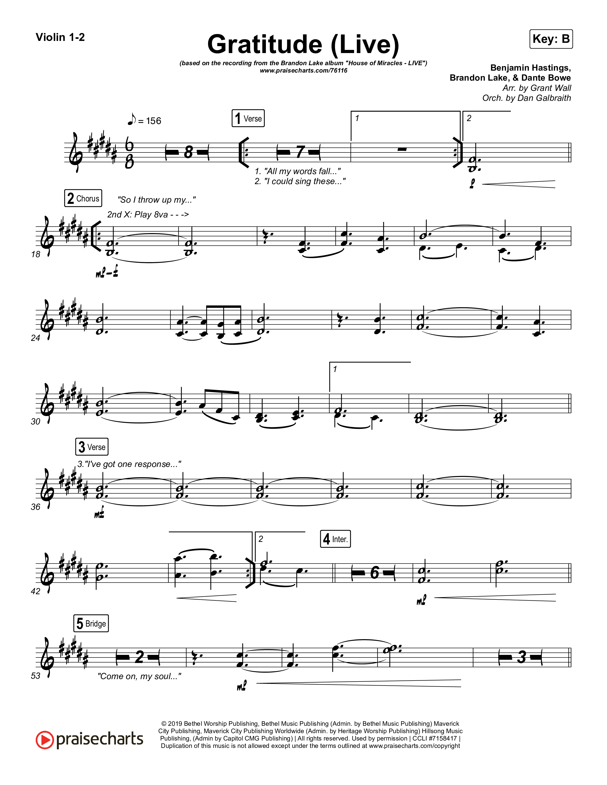 Download the Violin sheet music for Gratitude (Live) by Brandon Lake, from the album House Of Miracles (Live). This song was arranged by Grant Wall / Daniel Galbraith in the key of A, B, Bb, G, Gb.
