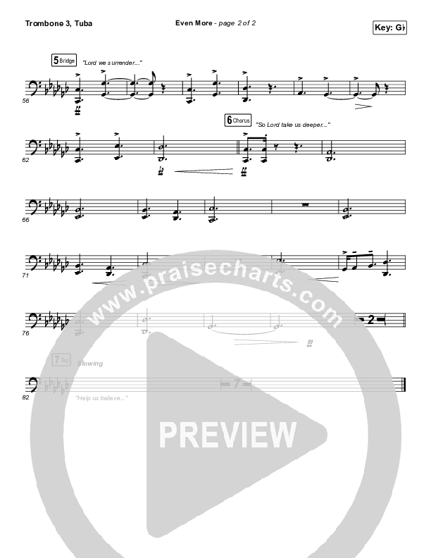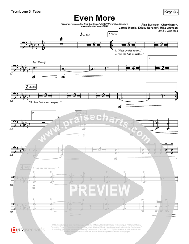 Download the Trombone 3/Tuba sheet music for Even More by Cross Point Music / Cheryl Stark, from the album Never Stop Singing. This song was arranged by Joel Mott in the key of G, Gb.