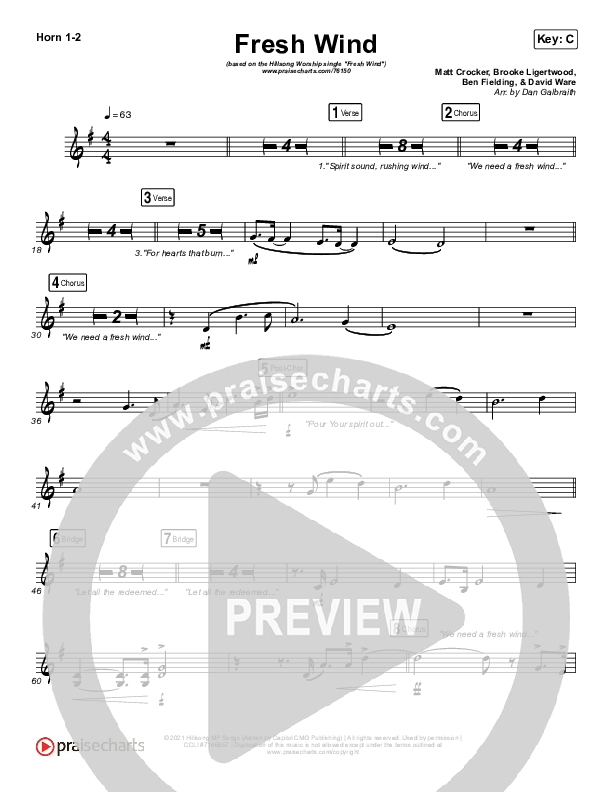 Download the French Horn sheet music for Fresh Wind by Hillsong Worship, from the album Fresh Wind - Single. This song was arranged by Daniel Galbraith in the key of C, D.
