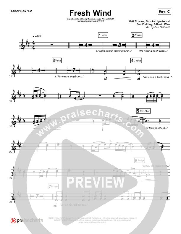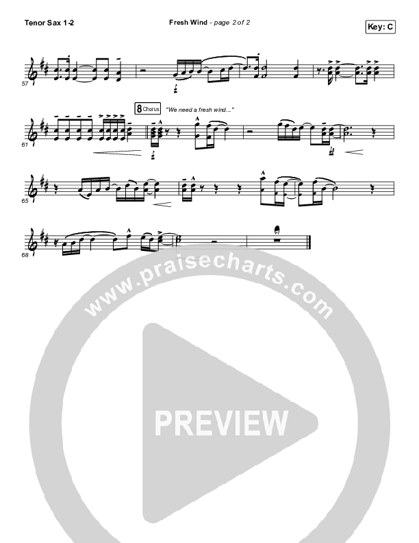 Download the Tenor Sax sheet music for Fresh Wind by Hillsong Worship, from the album Fresh Wind - Single. This song was arranged by Daniel Galbraith in the key of C, D.