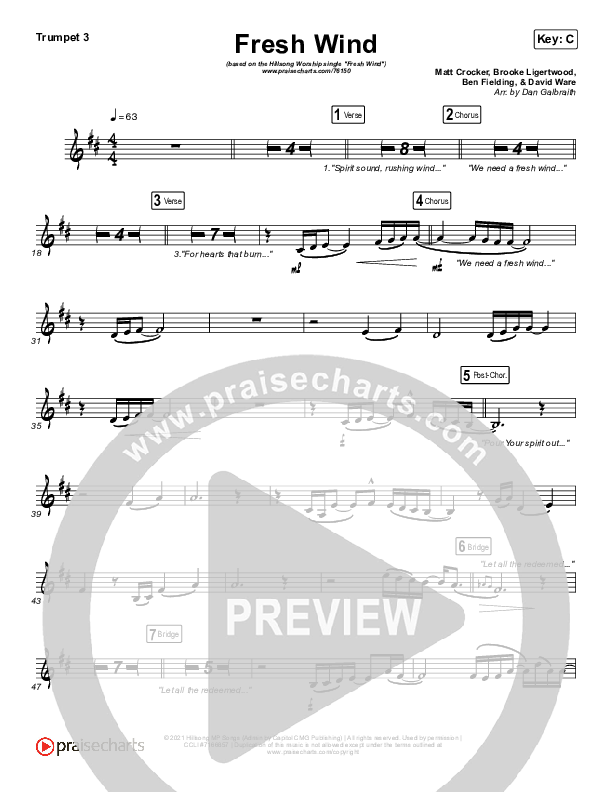 Download the Trumpet 3 sheet music for Fresh Wind by Hillsong Worship, from the album Fresh Wind - Single. This song was arranged by Daniel Galbraith in the key of C, D.