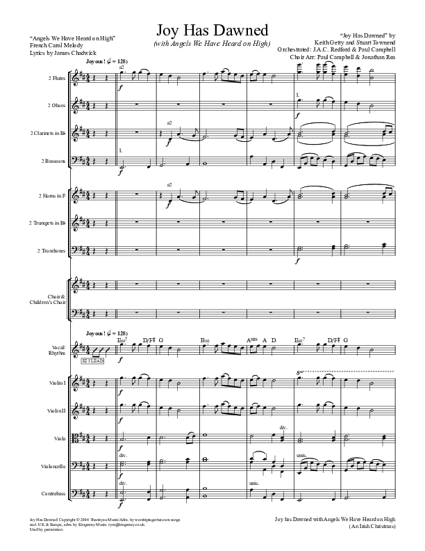 Download the Orchestration for Joy Has Dawned (with Angels We Have Heard On High) by Keith & Kristyn Getty, from the album Joy An Irish Christmas. This song was arranged by JAC Redford / Paul Campbell in the key of D.