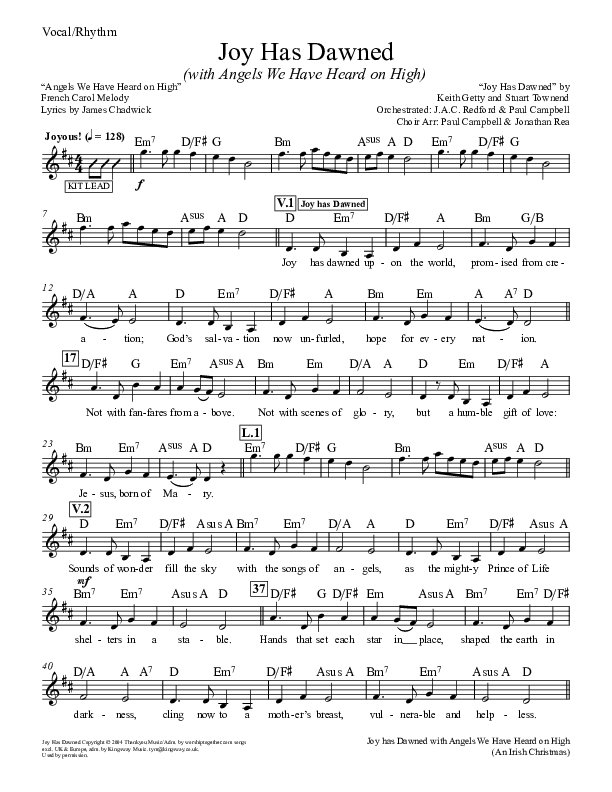 Download the Orchestration for Joy Has Dawned (with Angels We Have Heard On High) by Keith & Kristyn Getty, from the album Joy An Irish Christmas. This song was arranged by JAC Redford / Paul Campbell in the key of D.