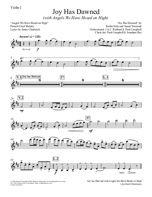 Download the Orchestration for Joy Has Dawned (with Angels We Have Heard On High) by Keith & Kristyn Getty, from the album Joy An Irish Christmas. This song was arranged by JAC Redford / Paul Campbell in the key of D.