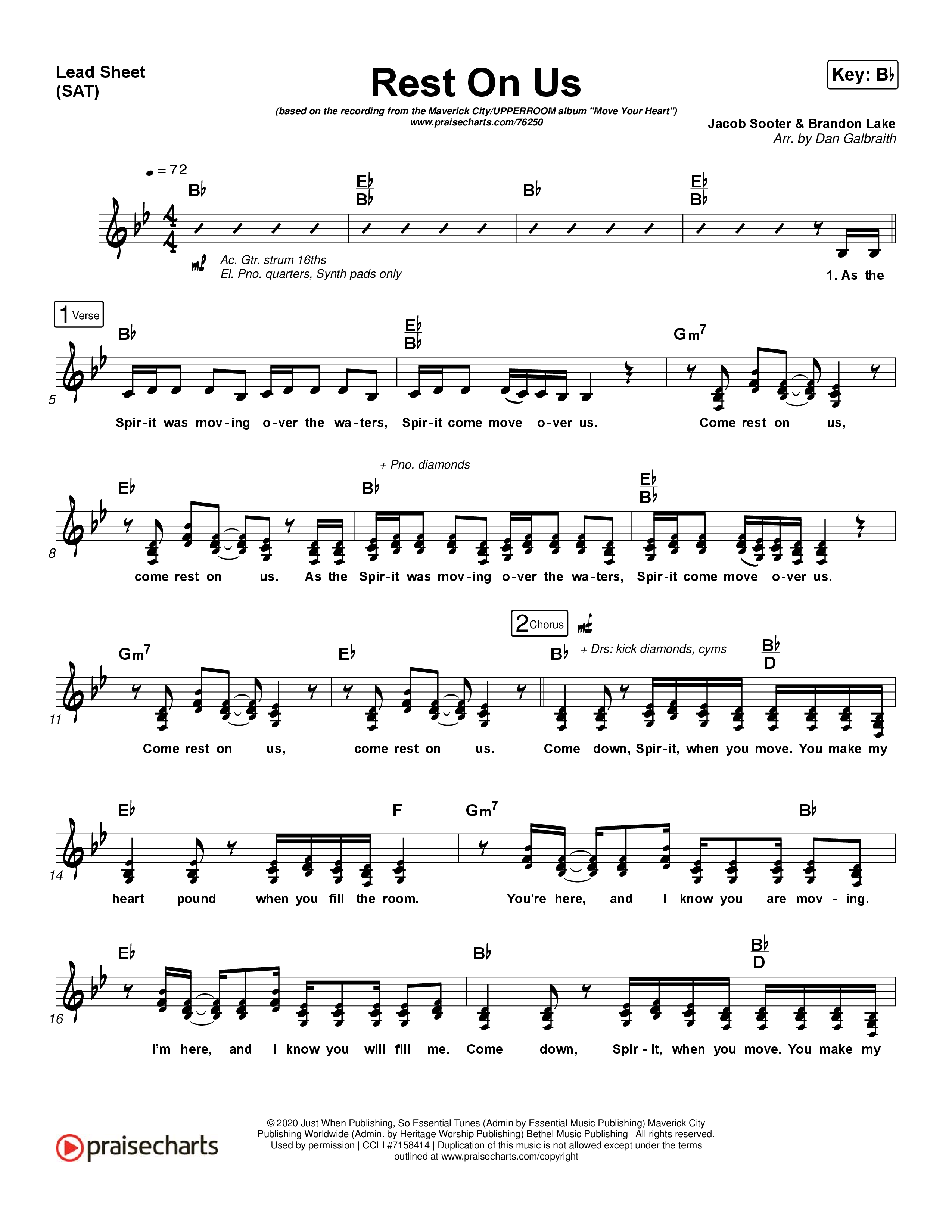 Download the sheet music for Rest On Us by Maverick City Music / UPPERROOM / Brandon Lake / Eniola Abioye, from the album Move Your Heart EP. This song was arranged by Daniel Galbraith in the key of Bb, C.