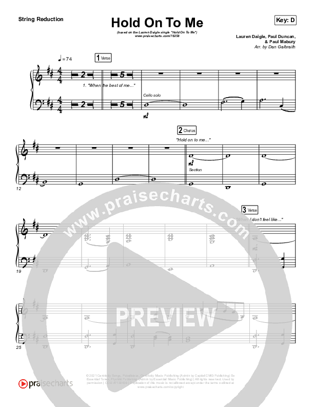Download the Orchestration for Hold On To Me by Lauren Daigle, from the album Hold On To Me - Single. This song was arranged by Daniel Galbraith in the key of D, Eb.