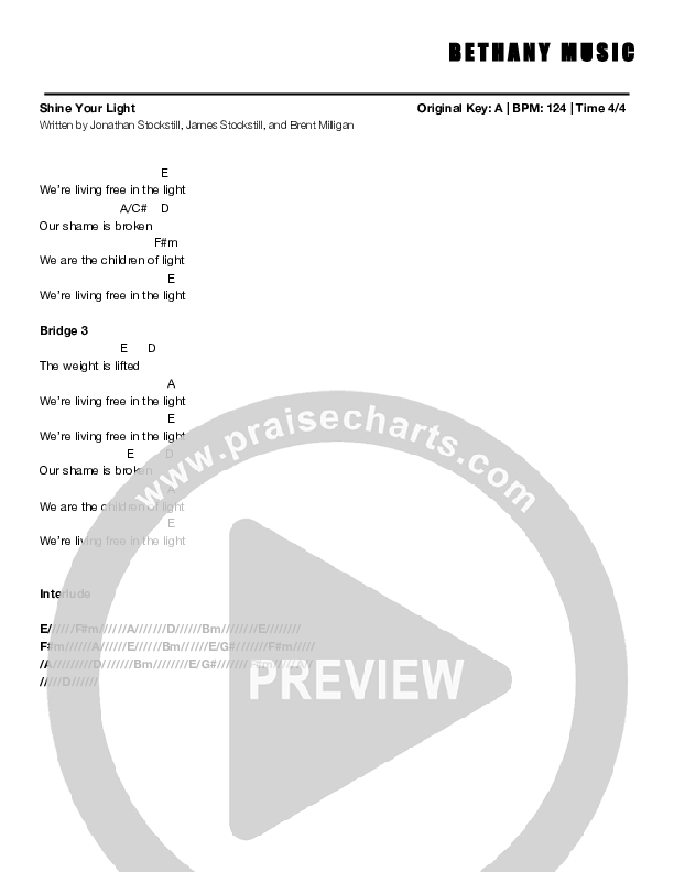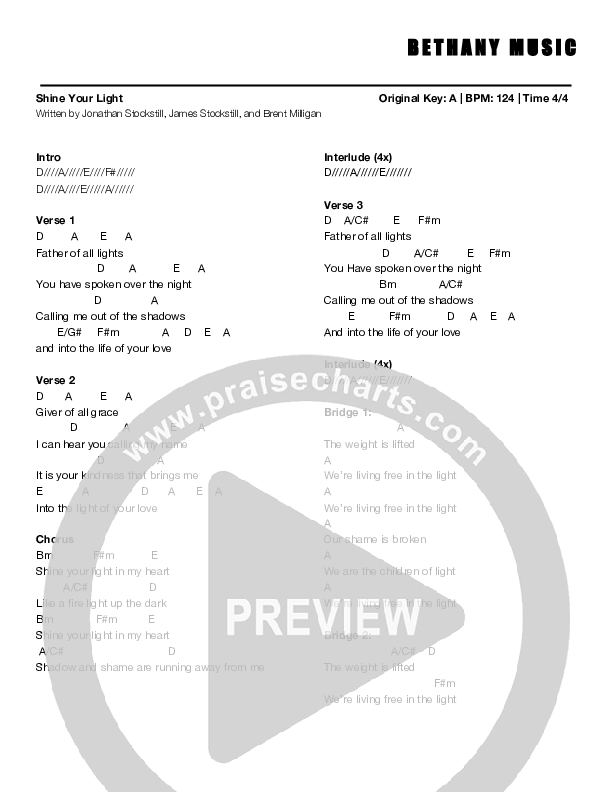 Download the PDF Chord Charts for Shine Your Light by Jonathan Stockstill, from the album Worth The Wait.