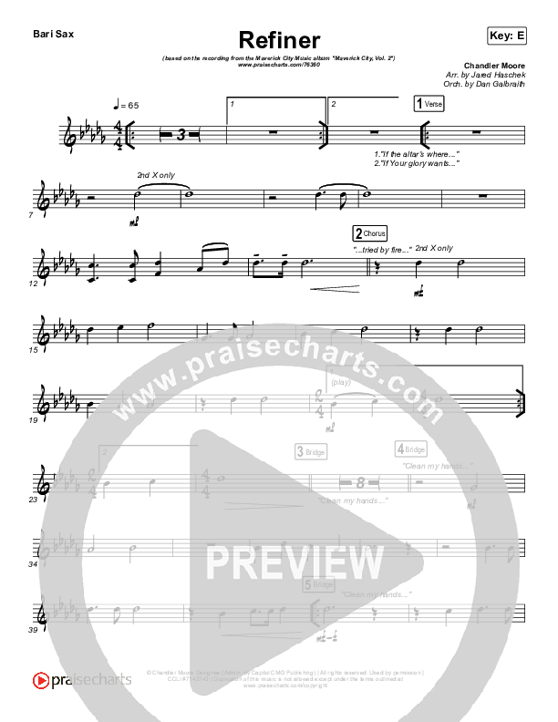 Download the Bari Sax sheet music for Refiner by Maverick City Music / Steffany Gretzinger, from the album Maverick City Vol. 2. This song was arranged by Jared Haschek / Daniel Galbraith in the key of E, F.